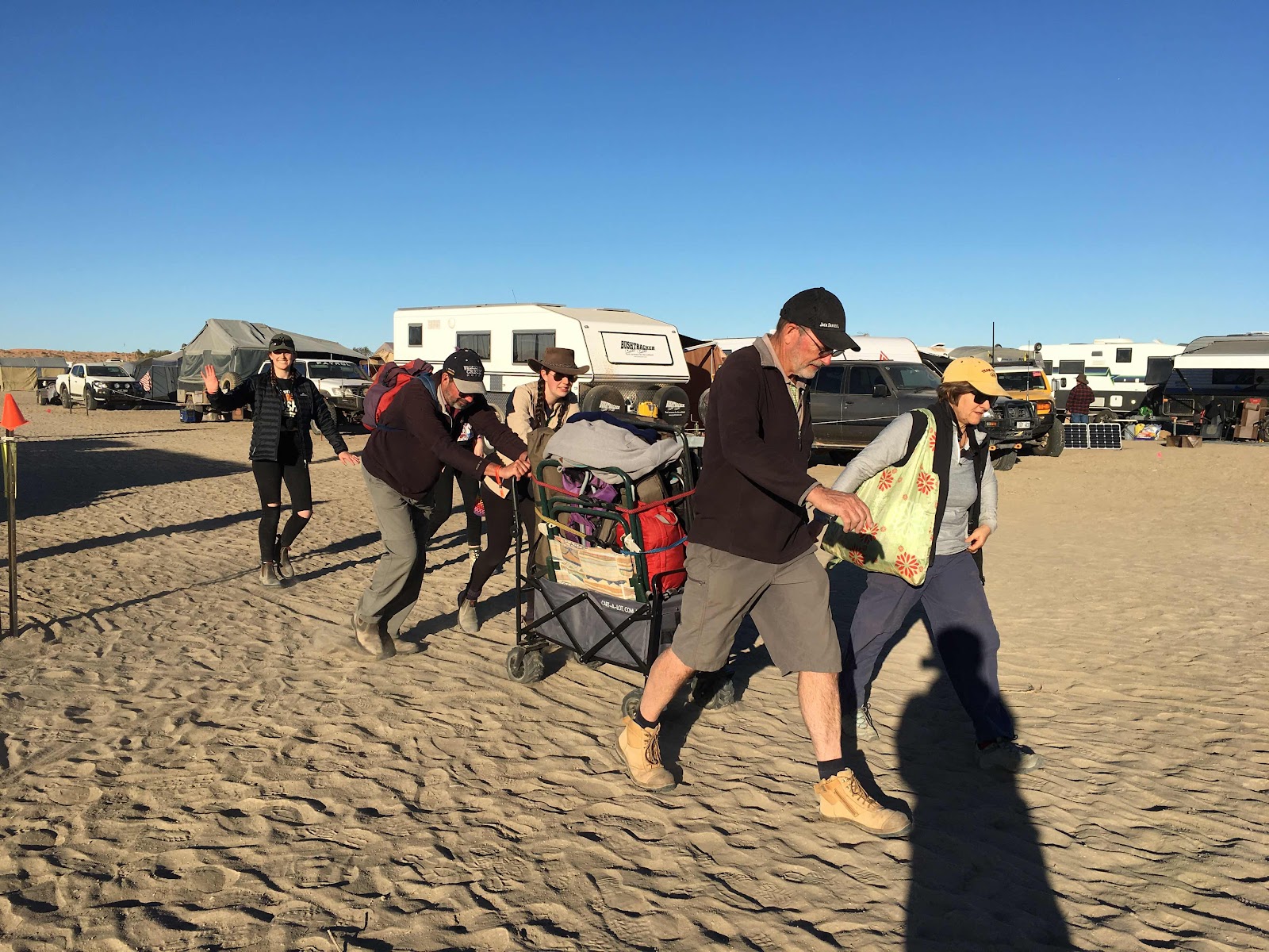 Then we packed our cart and pulled and pushed and dragged it back through the sand/dust. At least Steve, Sarah, Mary and I did. It certainly warmed us up.